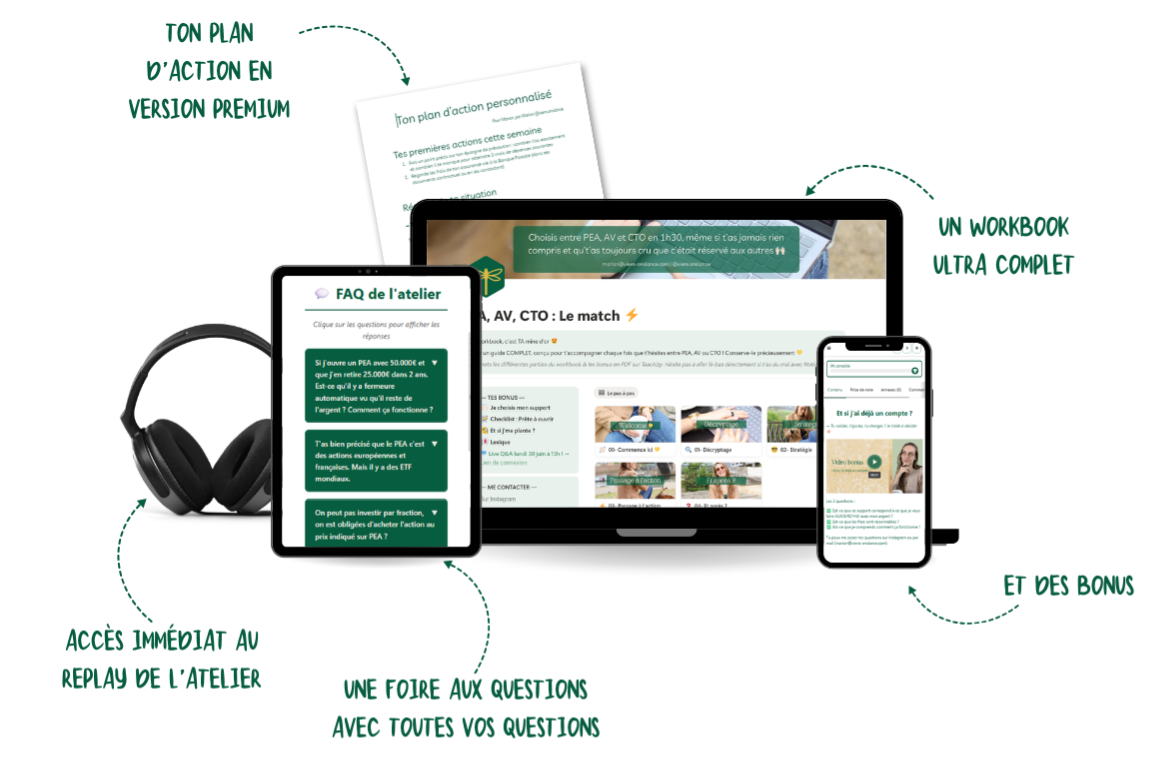 C'est justement POUR TOI que j'ai créé cet atelier. Il est fait pour celles qui veulent enfin comprendre le PEA, l'assurance-vie et le compte-titre. Même si tu pars de zéro.